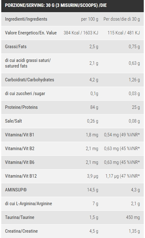 proteine del siero di latte concentrate (wpc), aminsup® (arginina cloridrato, creatina, taurina), maltodestrine, aromi, edulcoranti: acesulfame k e sucralosio, piridossina cloridrato (vitamina b6), riboflavina (vitamina b2), tiamina cloridrato (vitamina b1), cianocobalamina (vitamina b12), polvere di barbabietola.