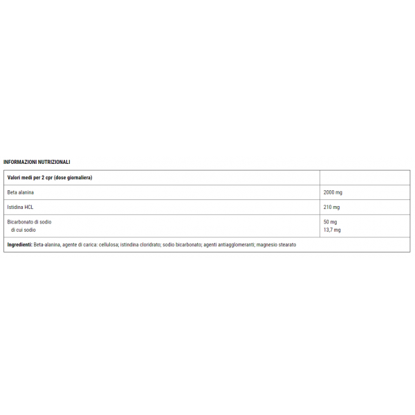 beta-alanina, agente di carica: cellulosa, istidina cloridrato, sodio bicarbonato, agenti antiagglomeranti: magnesio stearato, biossido di silicio