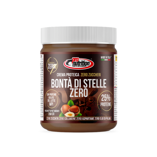 Crema zero bonta’ di stelle è una crema spalmabile a base di proteine isolate del siero del latte (WPI), e biscotto al cacao. La sua formulazione apporta ben il 25% di proteine e zero zuccheri. Non contiene olio di palma né sale e zuccheri aggiunti. Grazie alla sua spalmabilità ed al suo sapore di nocciola e biscotto al cacao è perfetto per un gustoso snack o per una colazione golosa in linea con uno stile di vita sano ed equilibrato con il giusto apporto di calorie e proteine.