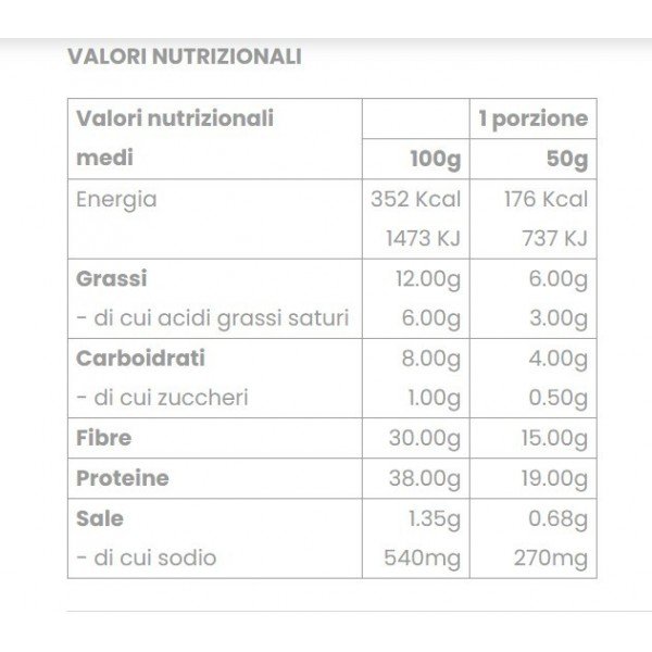 Per dose (50 g): Energia 176 Kcal 737 KJ Grassi 6.00 g – di cui acidi grassi saturi 3.00 g Carboidrati 4.00 g – di cui zuccheri 0.50 g Fibre 15.00 g Proteine 19.00 g Sale 0.68 g – di cui sodio 270 mg