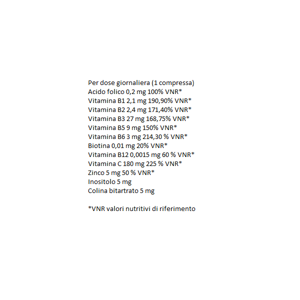Acido L-ascorbico, agente di carica: cellulosa microcristallina, niacina (vit. B3), calcio d-pantotenato (vit. B5), agenti di carica: carbossimetilcellulosa sodica, idrossipropilcellulosa, idrossipropilmetilcellulosa; colina bitartrato, zinco gluconato, inositolo, antiagglomerante: magnesio stearato, piridossina cloridrato, riboflavina (vit. B2), tiamina monoidrato (vit. B1), aroma menta, cera di carnauba, acido folico, biotina, cianocobalamina (vit. B12).