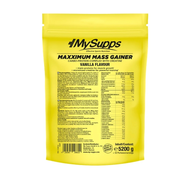 My Supps Maxximum Mass Gainer è un integratore alimentare specificamente studiato per chi vuole incrementare il peso e la massa muscolare rapidamente. Grazie alla sua formula bilanciata e l’elevato apporto calorico, è la scelta perfetta per atleti, sportivi e chiunque abbia difficoltà a prendere peso. Il prodotto si distingue per la presenza di proteine di alta qualità, creatina monoidrato utile per il supporto energetico, e un’alta concentrazione di carboidrati a rapido assorbimento che forniscono energia immediatamente disponibile. Il gusto cioccolato lo rende piacevole da consumare ogni giorno. Maxximum Mass Gainer può essere utilizzato anche da non atleti e persone sottopeso per favorire un veloce aumento di peso. È facile da preparare e si adatta facilmente a diversi orari della giornata, offrendo un valido sostegno durante la fase di costruzione muscolare e recupero.