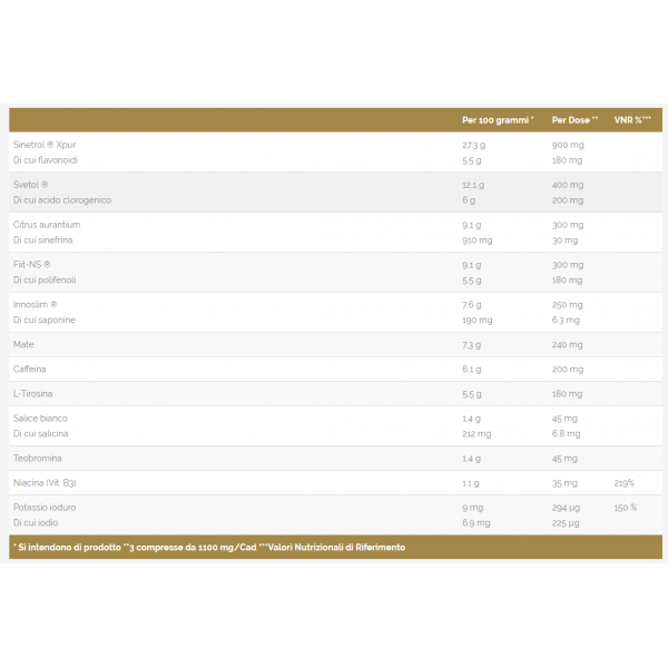sinetrol xpur (citrus aurantium frutto, citrus sinensis pericarpo, citrus paradisi macfad semi, citrus grandis osbeck semi, paullinia cupana kunt semi), yerba mate (ilex paraguayensis foglie), svetol (caffè verde 50% ac. clorogenico, coffea canephora robusta semi), fiit-ns (frutto: paullinia cupana, citrus grandis, vaccinum myrtillus, citrus sinensis, carica papaya, ananas sativus, fragraria vesca, pyrus malus, prunus armeniaca, prunus avium, ribes nigrum, vitis vinifera, olea europaea, cucumis sativus, foglie: camelia sinensis, brassica oleracea italica, brassica oleracea capitata, bulbo: allium sativum, allium cepa, radice: asparagus officinalis), citrus aurantium e.s. pericarpo, tirosina, caffeina, salice e.s. (salix alba corteccia dei rami), teobromina, niacina (vit.b3), potassio ioduro; stabilizzanti reologici: cellulosa microcristallina, pvp, silicio biossido, magnesio stearato.