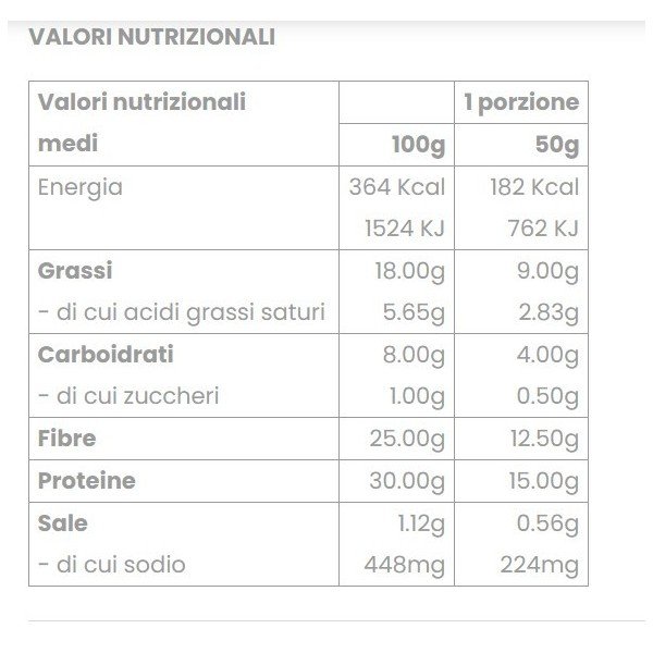proteine del grano (glutine), proteine di riso, proteine d’avena, fibra di frumento, fibra di acacia, olio extra vergine d’oliva, bicarbonato di sodio, sale, emulsionante: lecitina di girasole, E471, conservanti: sorbato di potassio.