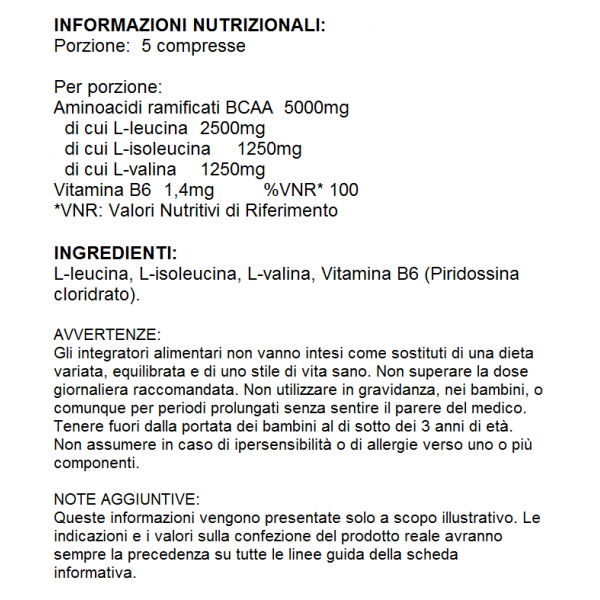 BCAA (L-Leucina, L-Isoleucina, L-Valina), vitamina B6, agenti di carica, antiagglomeranti.