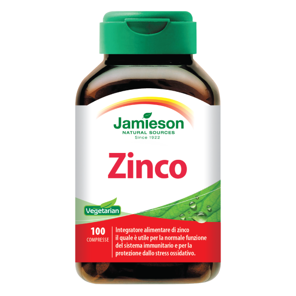 1 compressa di Zinco di Jamieson apporta il 100% del valore nutritivo di riferimento (dose giornaliera raccomandata) di zinco.